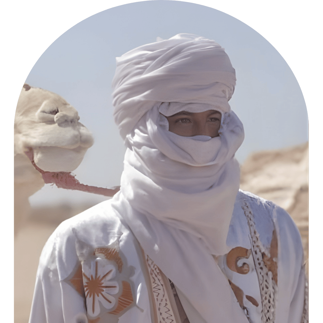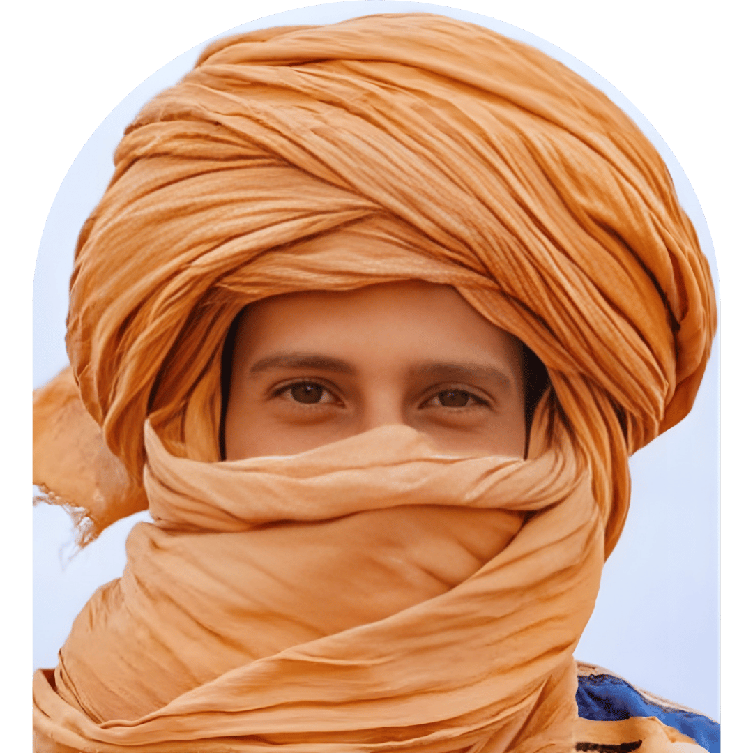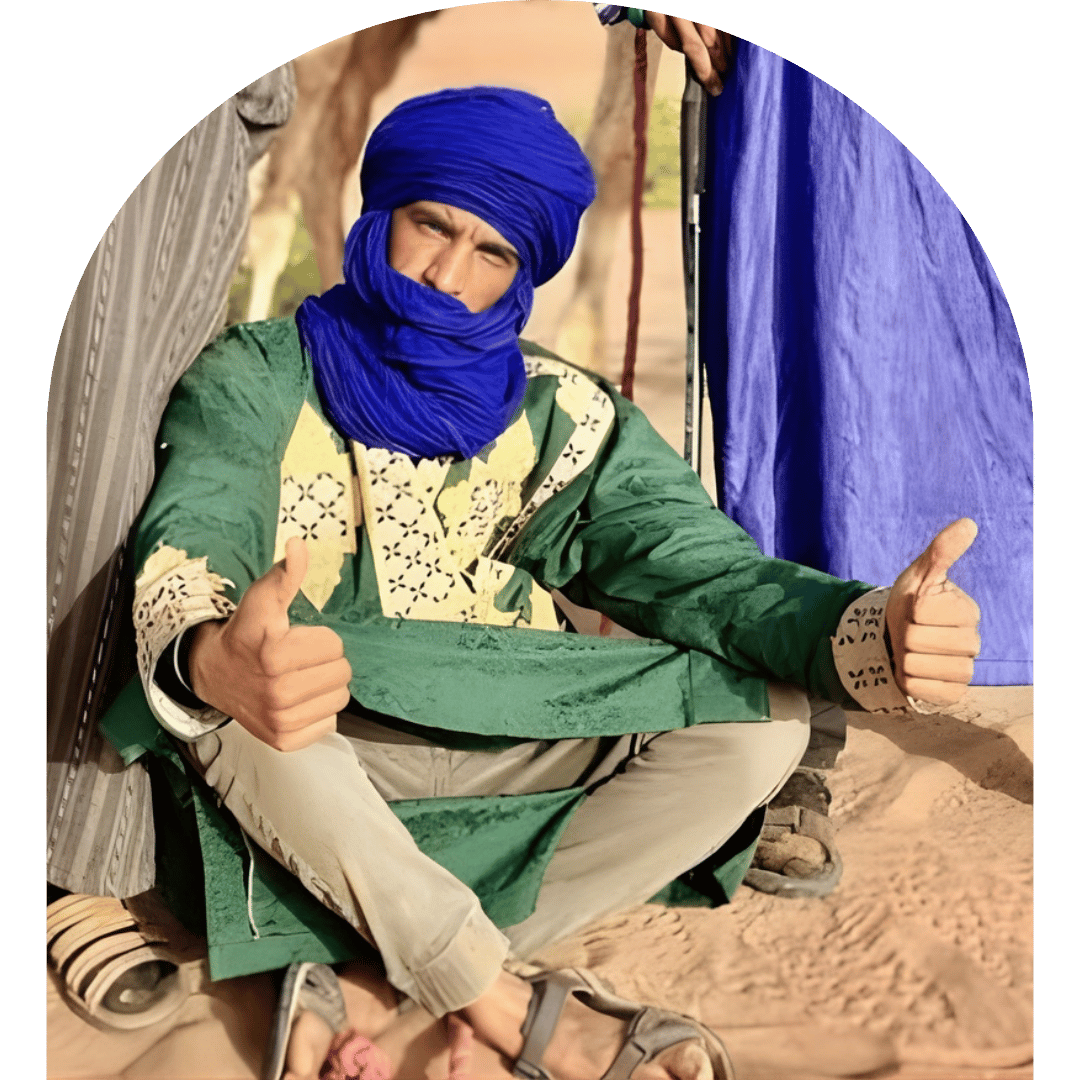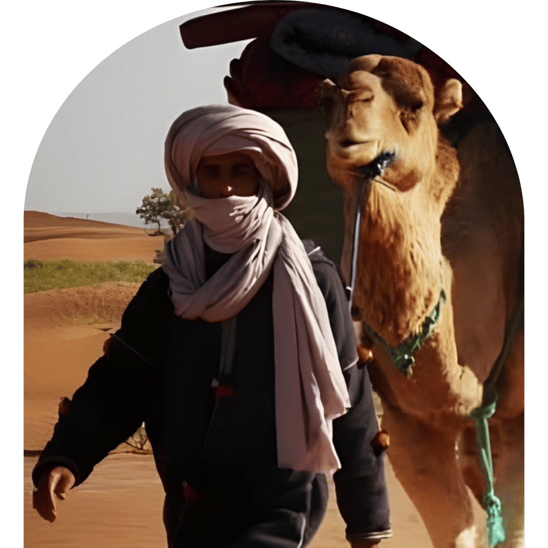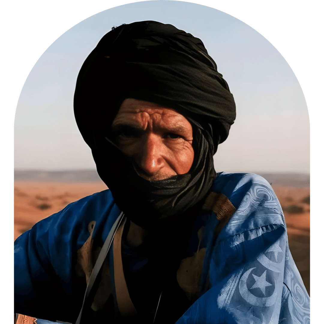 Behind every journey is Mohamed — a man born in the Moroccan desert, raised in a nomadic Blue Men family, and shaped by the rhythms of dunes, camels, and shared meals under open skies.