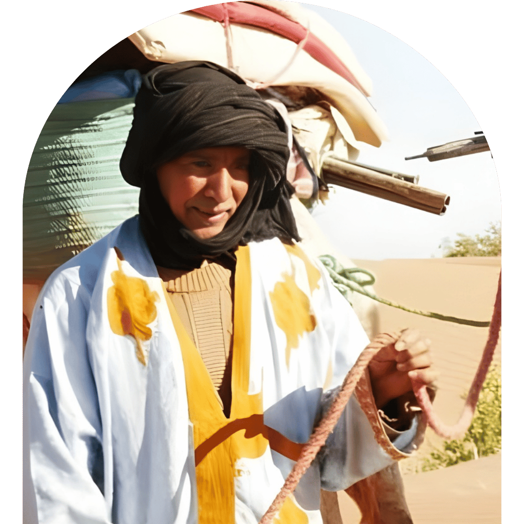 Mohamed grew up walking alongside camel caravans, helping his family move camps, and learning the traditions passed down through generations. Life in the desert taught him patience, resilience, humor, and the importance of community.